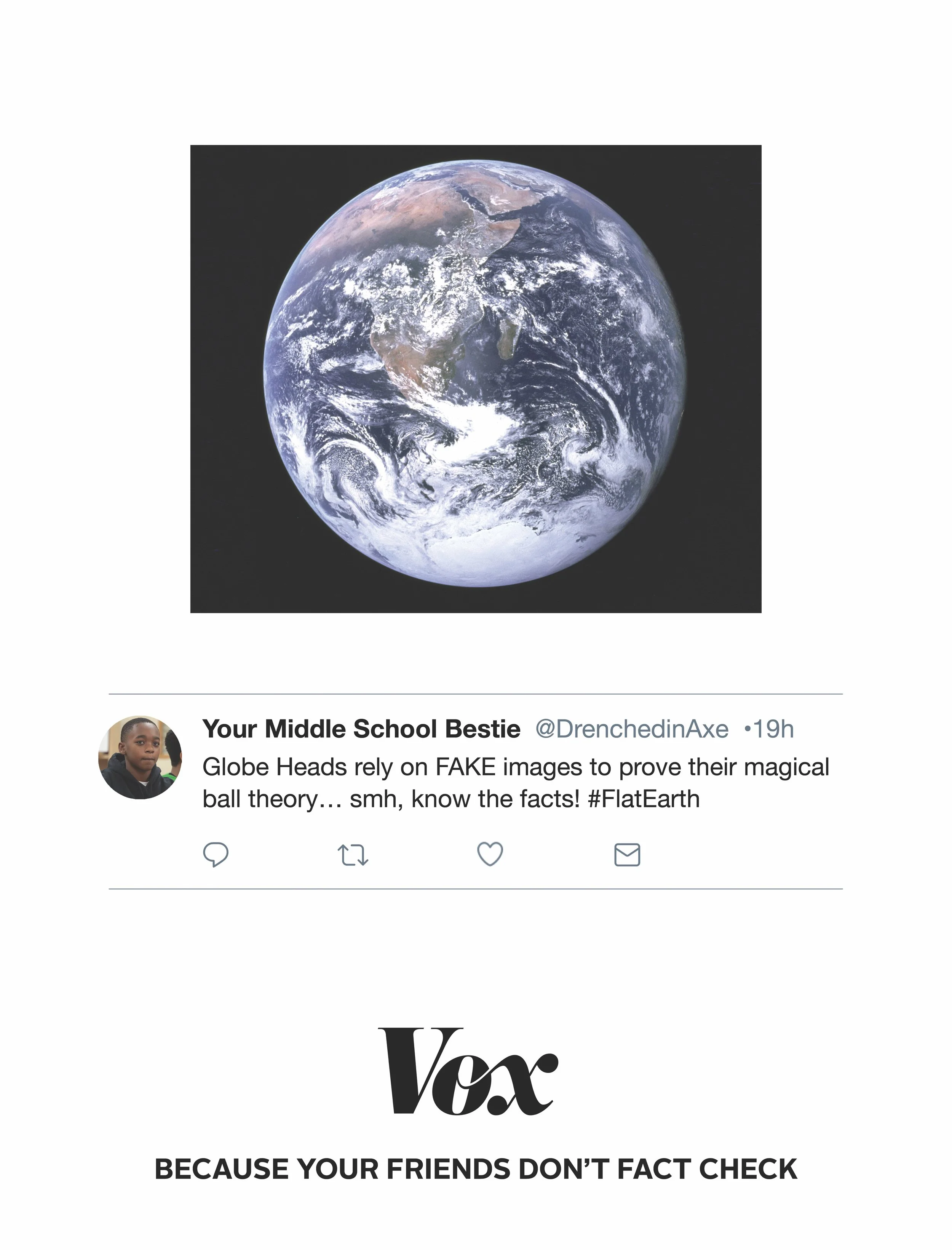 Motivate Millennials to actively separate fake news from credible news sources. Many millennials mistake information they see on social media as fact without checking the source. This campaign is to remind people, friends don’t fact check before posting, retweeting, etc.